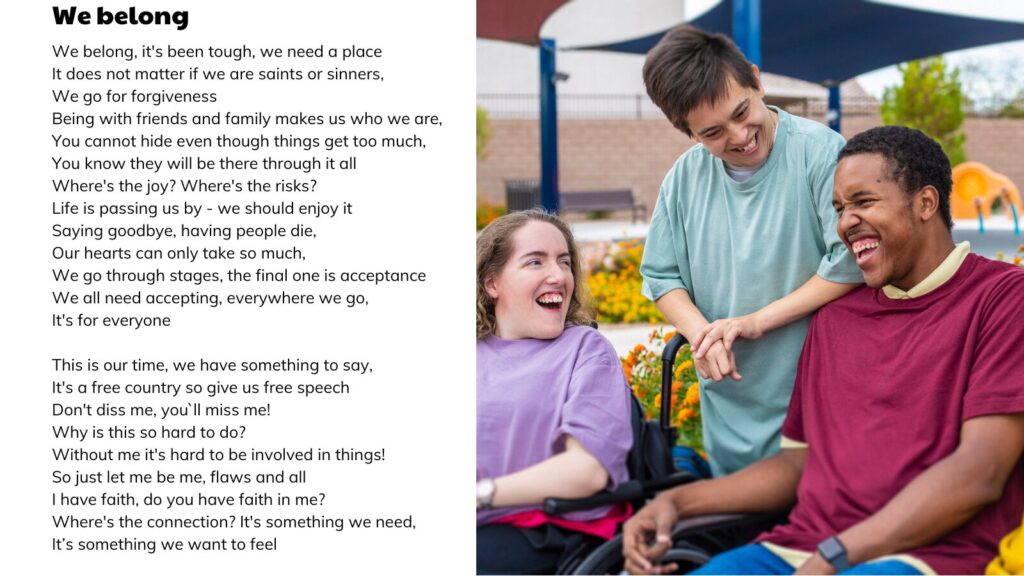 As part of a recent Learning Disability Week, Forum members wanted to express their thoughts in a poem and we were fortunate to have Jess Hardie, a poet with a learning disability, join us. Jess skillfully incorporated everyone’s words into this thought-provoking poem.